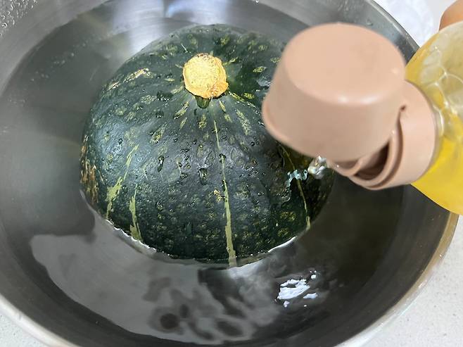 단호박은 베이킹파우더와 식초를 이용해 겉면을 박박 씻어주세요. 단호박 껍질에도 좋은 영양분이 많이 들어있어서, 껍질까지 드실 분들은 깨끗이 씻어주셔야 합니다.