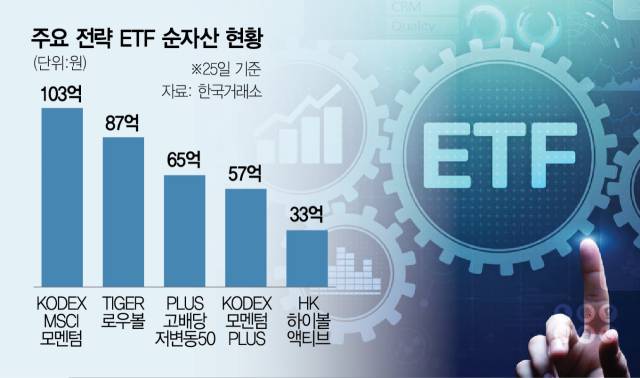 전략형 ETF는 크게 로우볼, 하이볼, 모멘텀 등 세 가지로 나뉜다. 로우볼 ETF는 상대적으로 주가 변동 폭이 작은 기업의 비중이 높아 하락장에서 유리하다. 반면 하이볼 ETF는 주가 변동 폭이 큰 기업 중심이라 상승장에서 초과 수익 달성에 낫다. 모멘텀의 경우 분기 혹은 월 단위로 주가 상승 폭이 큰 종목의 비중을 높이는 리밸런싱(재조정)을 거치며 하이볼보다 더 높은 수익률을 추구하도록 설계됐다.