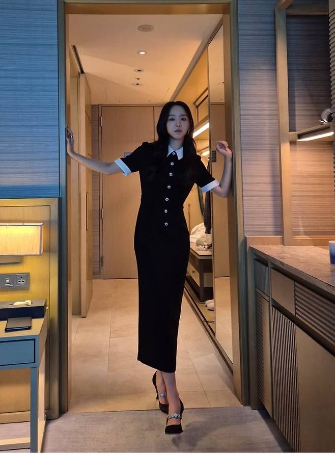 흑백 대비의 클래식한 카라 원피스를 선택해 우아하면서도 단정한 페미닌룩을 선보였습니다.