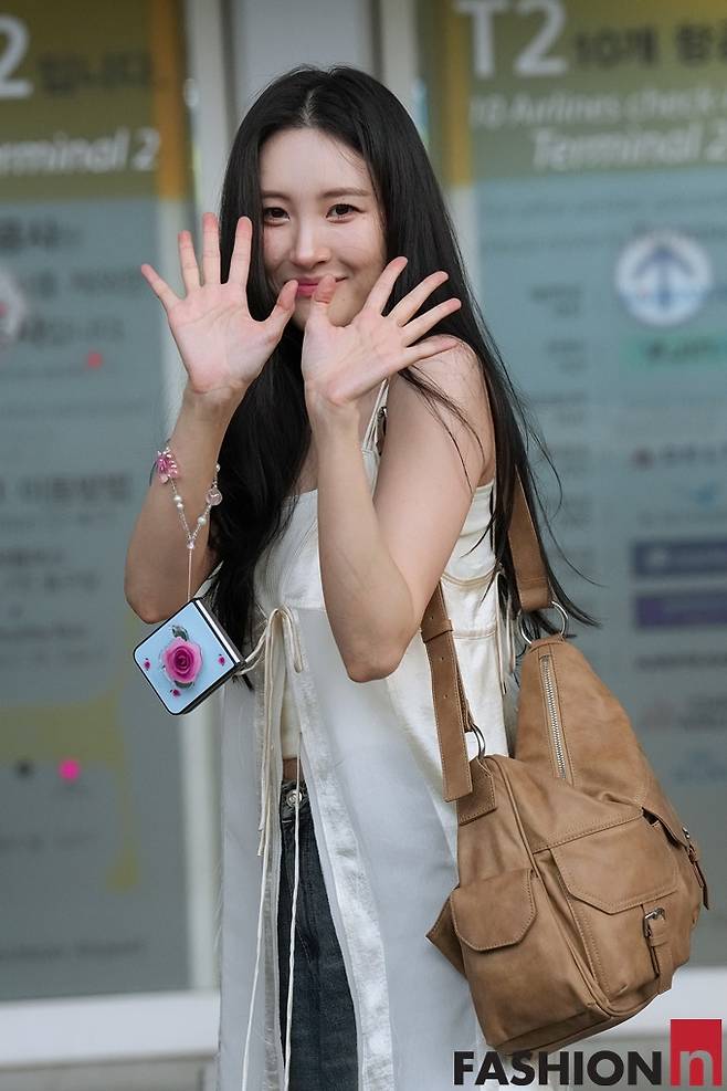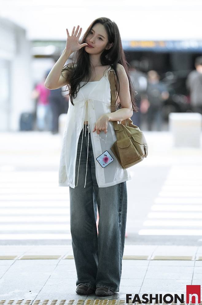이날 선미는 날개옷을 입은 듯 화이트 탱크톱에 은은하게 속이 비치는 홈웨어 스타일의 아우터를 걸치고 데님 팬츠를 매치한 출국룩으로 힙하면서도 로맨틱한 스타일을 완성했다.