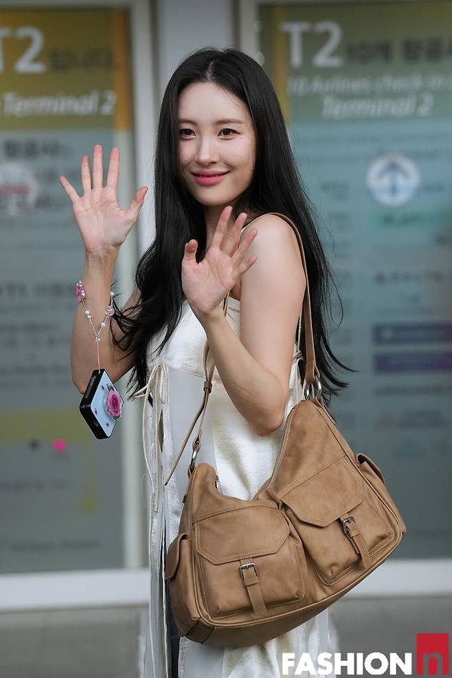 가수 선미(SUNMI)가 힙하면서도 로맨틱한 끈나시 아우터 출국룩으로 공항을 들썩이게 만들었다.
