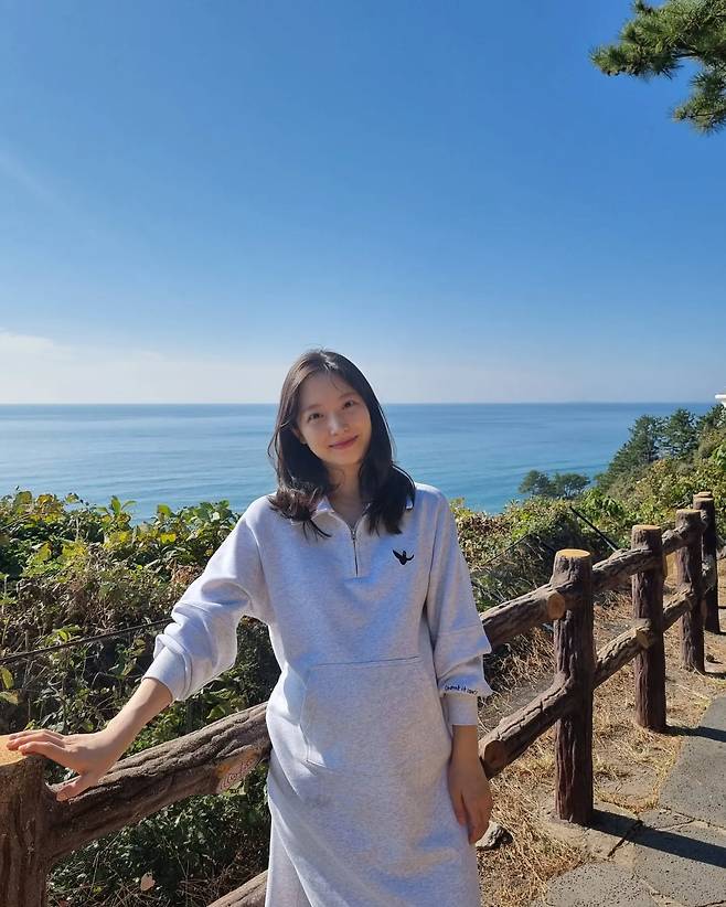 푸른 바다와 어우러지는 청량한 느낌의 그레이 컬러 하프 집업 원피스를 착용해 편안하면서도 활동적인 룩을 완성했다. 넉넉한 핏의 실루엣은 여유로운 분위기를 자아내며, 가슴 부분에 위치한 심플한 로고 자수가 자칫 밋밋할 수 있는 디자인에 포인트를 더한다. 지퍼를 살짝 내려 자연스러운 넥 라인을 연출했으며, 소매를 걷어 올려 꾸미지 않은 듯한 내추럴한 멋을 살렸다. 전체적으로 군더더기 없는 디자인으로 여행지나 일상에서 부담 없이 즐길 수 있는 실용적인 스타일링을 보여준다.
