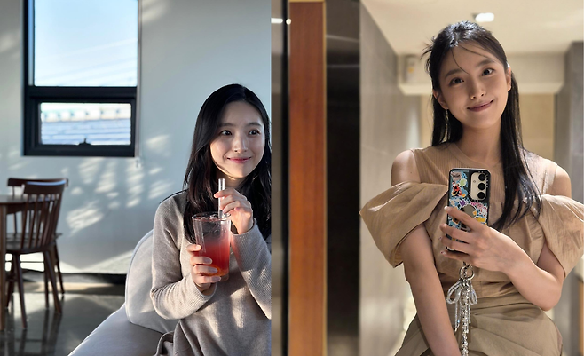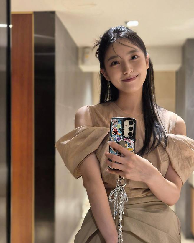거울 셀카 속에서는 어깨 라인이 드러나는 독특한 디자인의 베이지 컬러 의상으로 트렌디한 감각을 뽐냈다. 어깨 부분의 과감한 컷아웃과 풍성한 퍼프소매 디자인은 페미닌하면서도 화려한 느낌을 동시에 전달한다. 여기에 화려한 장식이 달린 휴대폰 스트랩과 케이스를 매치하여 키치한 포인트를 더했다. 자연스럽게 묶어 올린 헤어스타일과 잔머리는 의상의 화려함을 중화시키며 청순한 매력을 더해주고 있다.