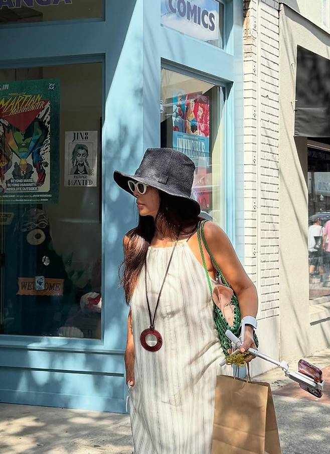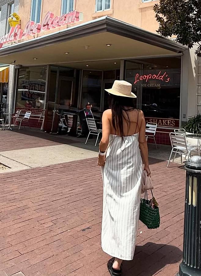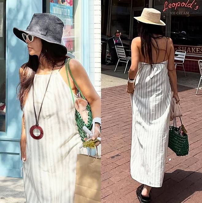공개한 사진에서 황신혜는 등이 드러난 내추럴 스트라이프 패턴의 린넨 홀터넥 백리스 롱 원피스에 버킷햇을 매치한 비치룩으로 감각적이면서도 여유로움이 묻어나는 여행 스타일을 선보였다.