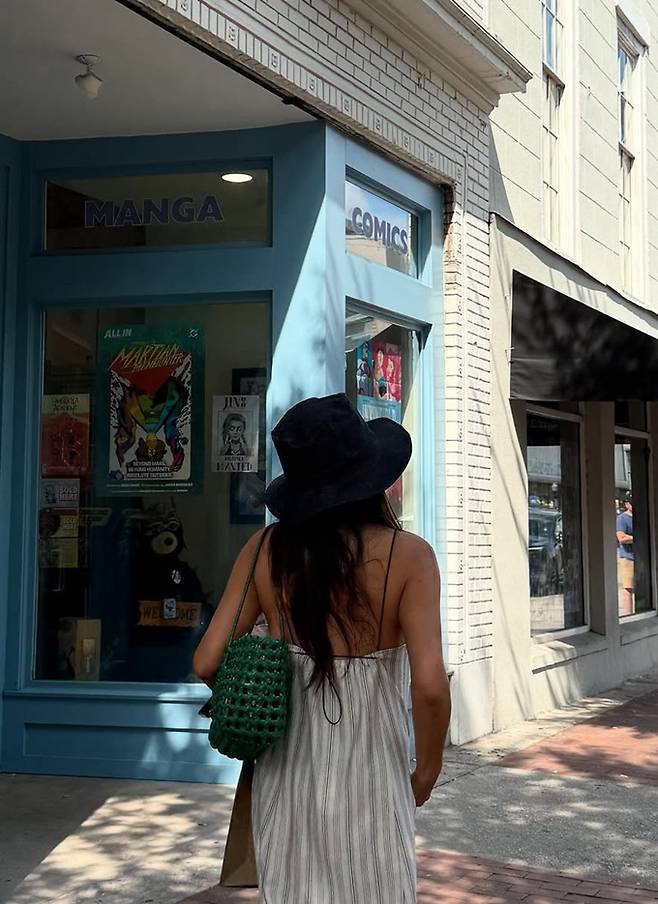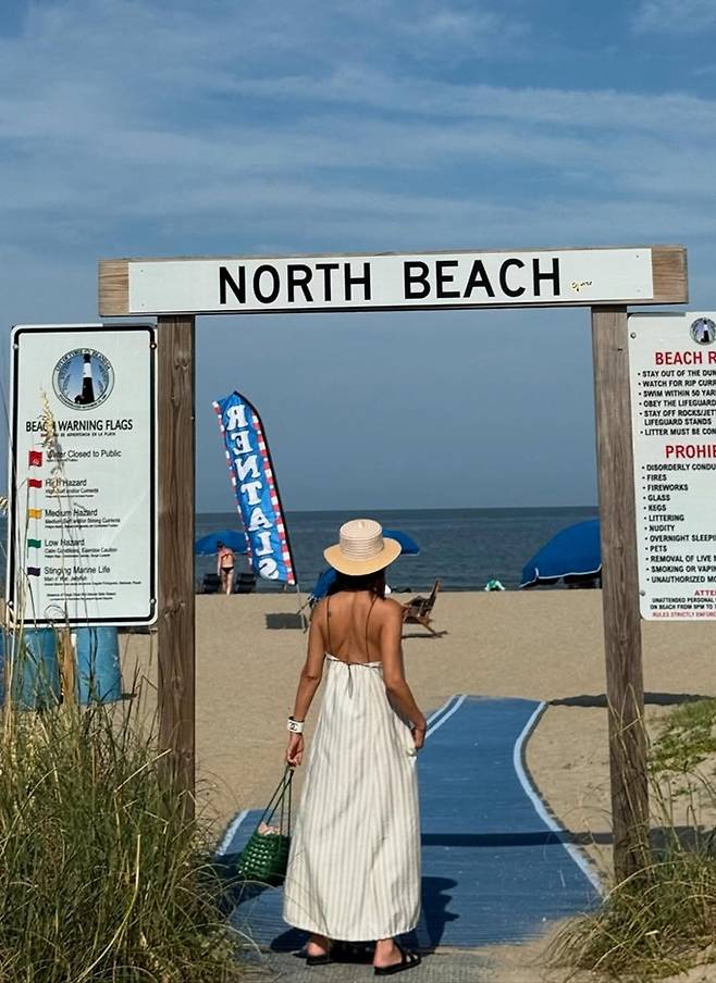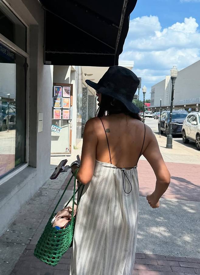 또 여기에 블랙 와이드 햇과 화이트 프레임 선글라스, 그린 컬러의 크로셰 숄더백, 원형 펜던트 목걸이, 화이트 워치 등을 매치해 감각적인 비치룩을 완성했다.