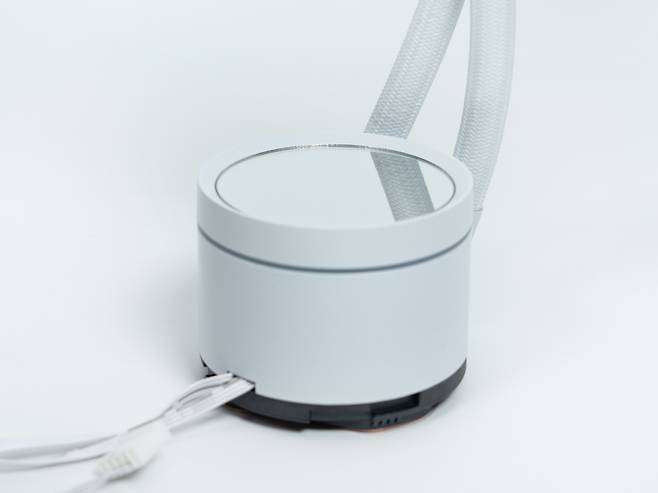 펌프는 정사각형 형태로 깔끔한 외관을 갖추고 있으며, 중앙에는 인피니티 미러 디자인이 적용되어 있어 화려한 RGB 효과를 제공합니다. 또한, 펌프 하단에는 37 x 33mm 크기의 대형 구리 베이스가 탑재되어 있으며, 최신 고성능 CPU의 발열을 효과적으로 해소할 수 있도록 마이크로 핀 설계가 적용되었습니다.