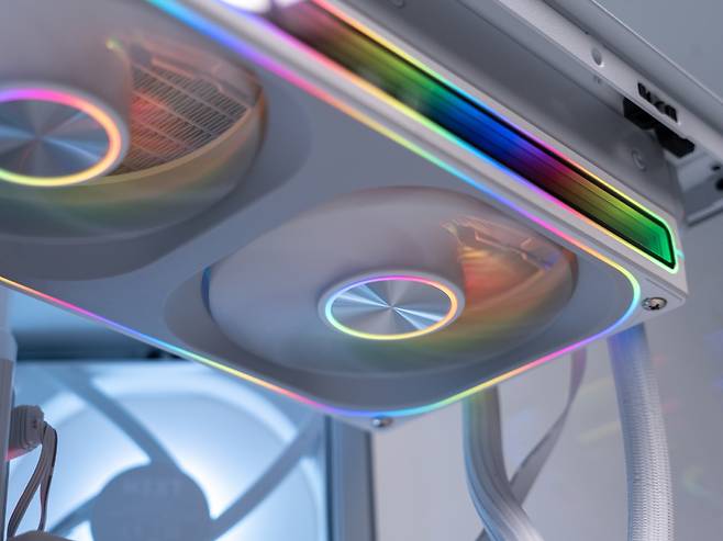 전원을 켜면 펌프와 쿨러의 RGB 조명이 다채로운 색상으로 빛나며, 몽환적이면서도 세련된 분위기를 연출합니다. RGB 조명 효과는 메인보드의 ARGB 소프트웨어와 연동해서 색상을 변경할 수 있습니다. 화이트 모델은 화이트 데스크탑 셋업을 원하는 사용자들에게 깔끔한 디자인과 감각적인 조명 효과를 극대화할 수 있습니다.