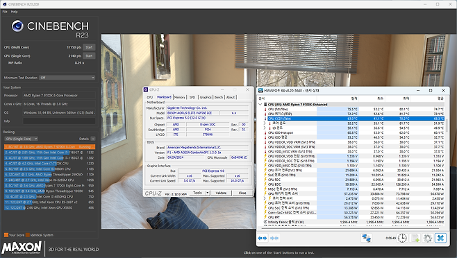 AMD Ryzen 9700X 순정 상태로 PBO는 끄고, 커옵은 적용하지 않은 상태로 아이들 온도와 씨네벤치 R23을 구동한 결과입니다.