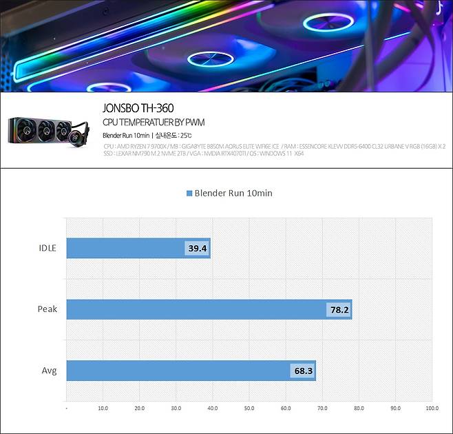 존스보 TH-360의 쿨링팬은 독특하게 유니바디 스타일의 디자인으로 그동안 보왔던 수랭쿨러와 달리 깔끔한 일체감을 제공합니다.