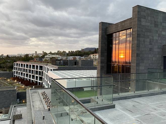 햇살이 부서져 하늘과 벌반 차이 없어 보이는 오후 풍경은 몽환적이기까지 했다. 입구부터 호텔 로비까지 들어오는 동선에서는 마치 멕시코 고급 휴양리조트에 온 것 같은 기분이 들었다. 제주에도 이런 풍경이 있구나, 리조트 입구에서 손님을 맞이하는 직원 유니폼, 돌을 끼어맞춘 거대한 벽, 은빛 장막 같이 고요한 제주 먼바다, 자연과 공간을 채운 모든 디테일이 영리하게 상호작용해 이전에는 없던 제주를 보여준다.