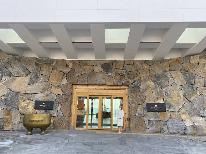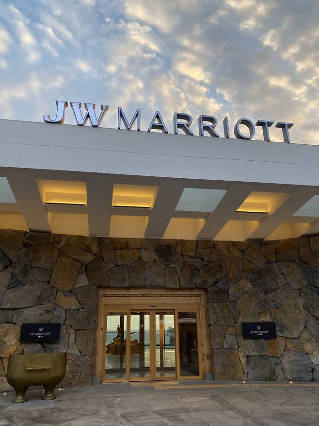 JW 메리어트 제주 리조트 첫인상은 기대 이상이었다. 일반 도로에서 빠져나와 바다쪽으로 내려오면 제주 현무암 등 돌을 깎아 만든 리조트 입구가 보인다. 나폴거리는 하얀 원피스를 입은 직원이 문 앞에서 반갑게 맞아줬다.