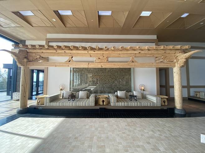 프론트 데스크 주변에 한국 전통 가옥에서 볼 수 있는 나무 처마와 지붕 골조를 설치했다. 한국 전통 가옥 마루에서 영감을 받은 것 같은 소파에 앉으면 직원이 웰컴티를 가져다준다. 이곳에서 차를 마시면서 체크인을 한다.