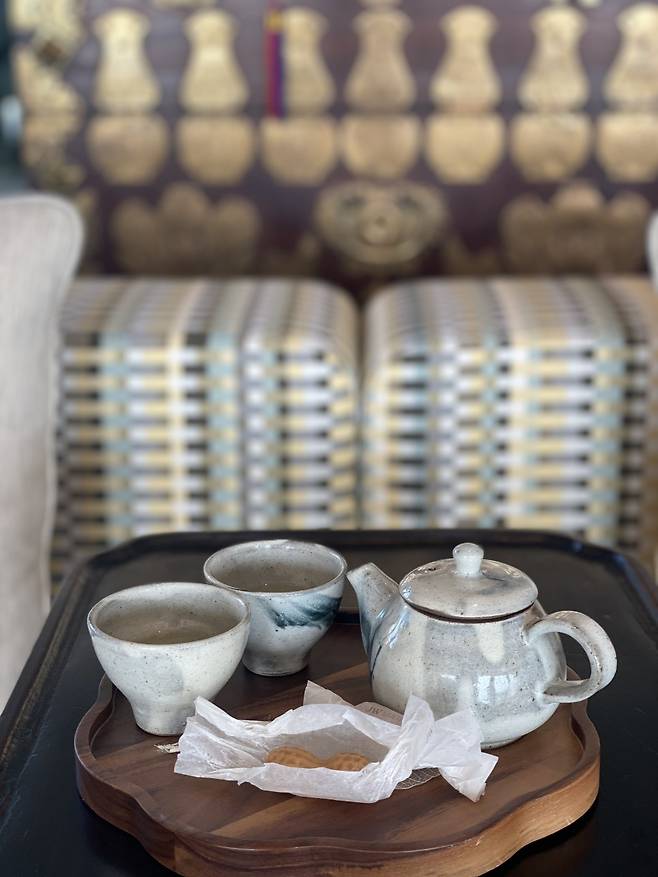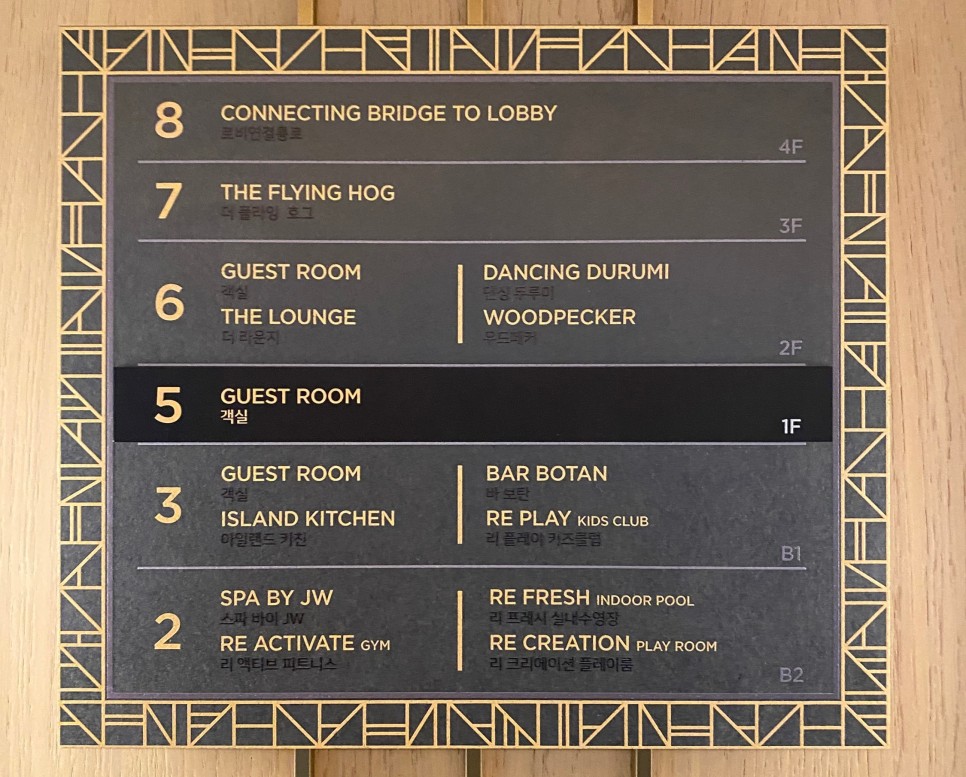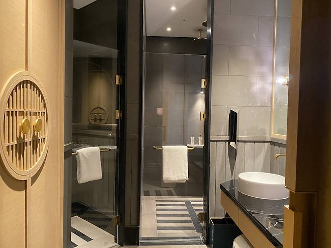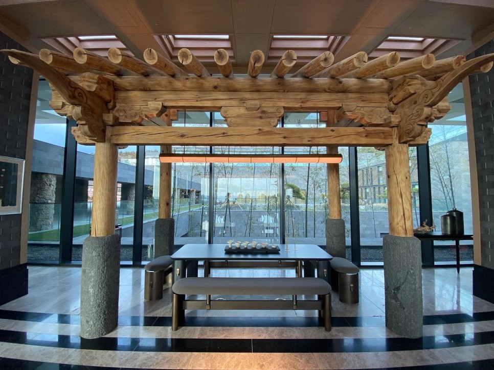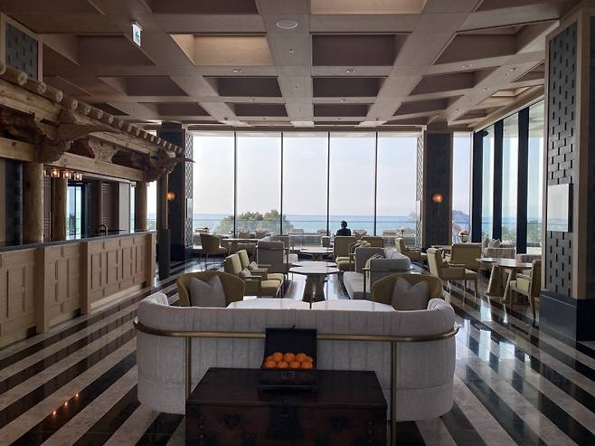 프론트 데스크 주변에 한국 전통 가옥에서 볼 수 있는 나무 처마와 지붕 골조를 설치했다. 한국 전통 가옥 마루에서 영감을 받은 것 같은 소파에 앉으면 직원이 웰컴티를 가져다준다. 이곳에서 차를 마시면서 체크인을 한다.