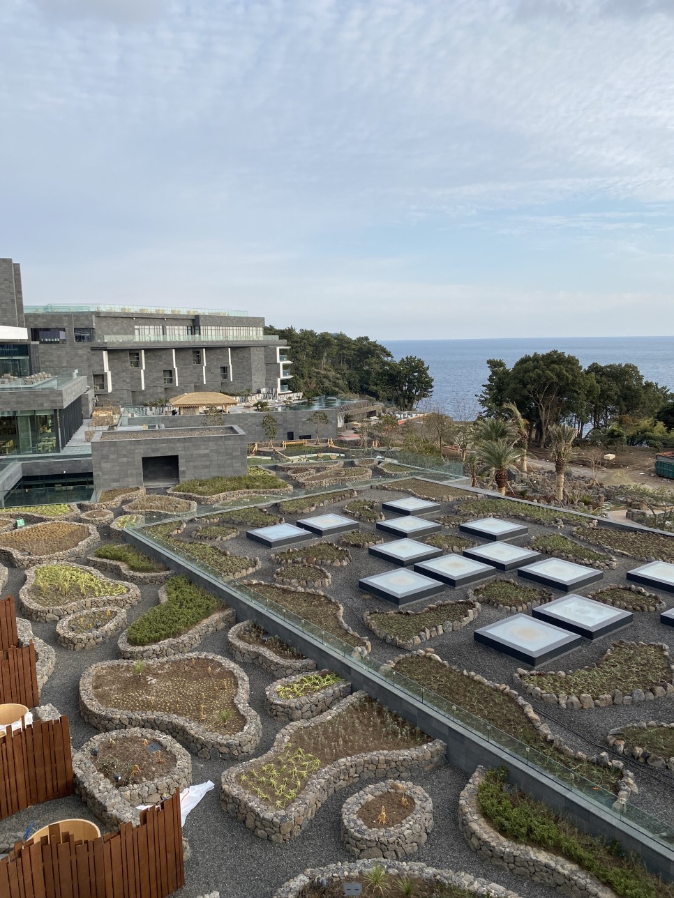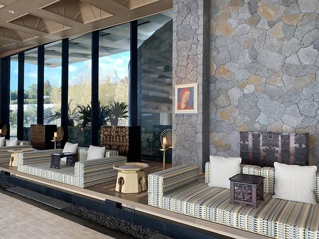 햇살이 부서져 하늘과 벌반 차이 없어 보이는 오후 풍경은 몽환적이기까지 했다. 입구부터 호텔 로비까지 들어오는 동선에서는 마치 멕시코 고급 휴양리조트에 온 것 같은 기분이 들었다. 제주에도 이런 풍경이 있구나, 리조트 입구에서 손님을 맞이하는 직원 유니폼, 돌을 끼어맞춘 거대한 벽, 은빛 장막 같이 고요한 제주 먼바다, 자연과 공간을 채운 모든 디테일이 영리하게 상호작용해 이전에는 없던 제주를 보여준다.