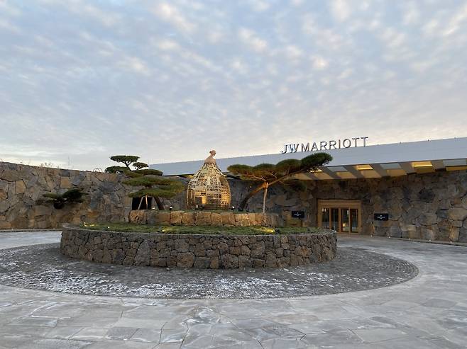 JW 메리어트 제주 리조트 첫인상은 기대 이상이었다. 일반 도로에서 빠져나와 바다쪽으로 내려오면 제주 현무암 등 돌을 깎아 만든 리조트 입구가 보인다. 나폴거리는 하얀 원피스를 입은 직원이 문 앞에서 반갑게 맞아줬다.
