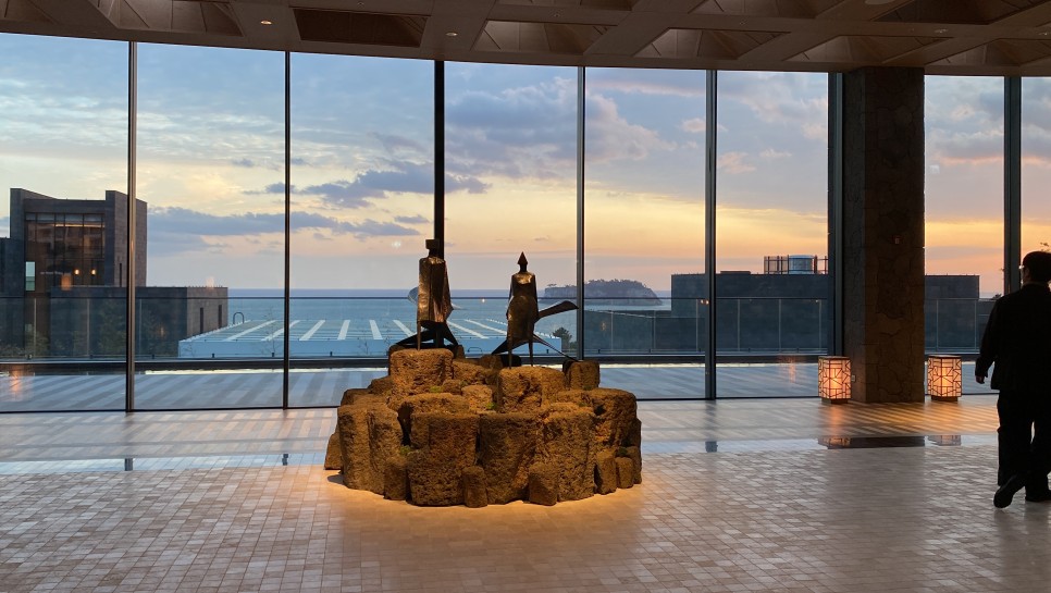 로비 공간 한쪽면은 통유리창이다. 너른 로비 한가운데 실제 나무도 심어놨다. 제주를 대표하는 감귤나무다. 로비가 있는 공간이 8층이다. 이곳에서 시작해 한층한층 아래로 호텔 공간이 펼쳐진다.