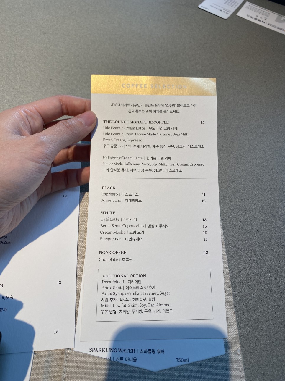 객실을 예약하지 못했다면, 시간이 없어 딱 한 곳만 방문해야 한다면 더 라운지를 추천한다. 시원한 바다 뷰가 펼쳐지는 더 라운지에서는 맛있는 커피와 차, 애프터눈 티세트 등을 판다. 제주 레몬과 당근, 가파도 청보리 그리고 우도 땅콩 등을 이용한 디저트 메뉴가 있다.