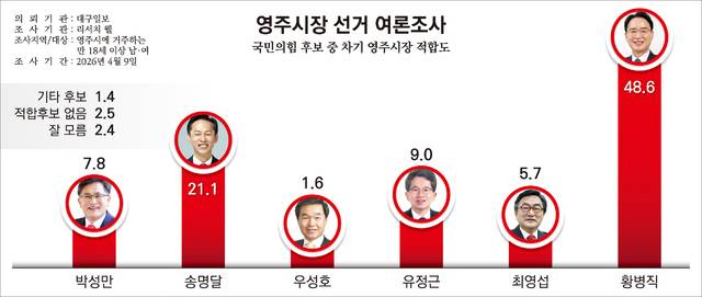 대구일보가 여론조사회사인 리서치 웰에 의뢰해 지난 9일 영주시에 거주하는 만 18세 이상 남녀 503명을 대상으로 실시한 조사 결과, 황 전 위원장은 50.2%의 지지를 얻어 선두를 기록했다. 2위인 송명달 전 해양수산부 차관(19.8%)을 큰 격차로 따돌린 수치로, 사실상 '1강 구도'가 굳어진 양상이다.