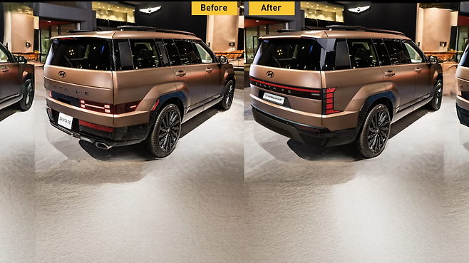 테일램프 디자인은 논란의 핵심이었던 만큼 가장 극적인 변화가 적용됐다. 위치를 위로 올려 시인성을 높였으며, 좌우로 길게 뻗은 일자형 호라이즌 램프는 하이엔드 SUV의 분위기를 자아낸다. 블록형 구조와 펜더까지 확장된 그래픽은 고급감을 배가시키고, 방향지시등 통합과 번호판 상단 이설로 전체적인 비율 역시 개선되었다.