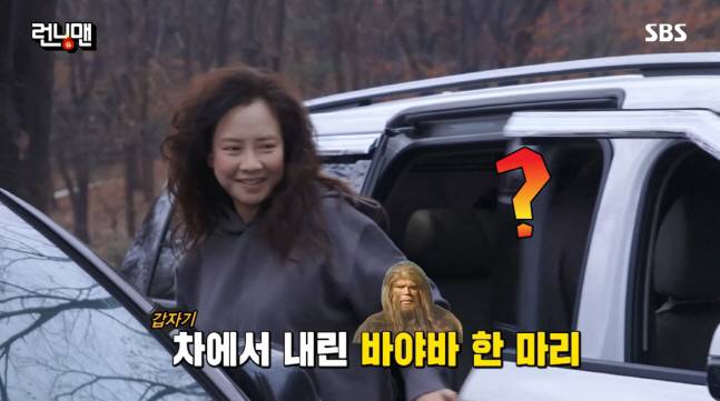 차에서 내리는 모습으로 등장한 송지효는 퉁퉁 부은 얼굴에 '해그리드'를 연상시키는 헤어스타일로 눈길을 끌었다.