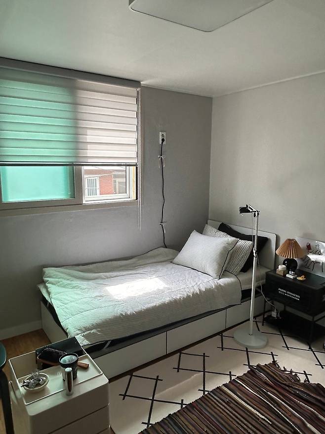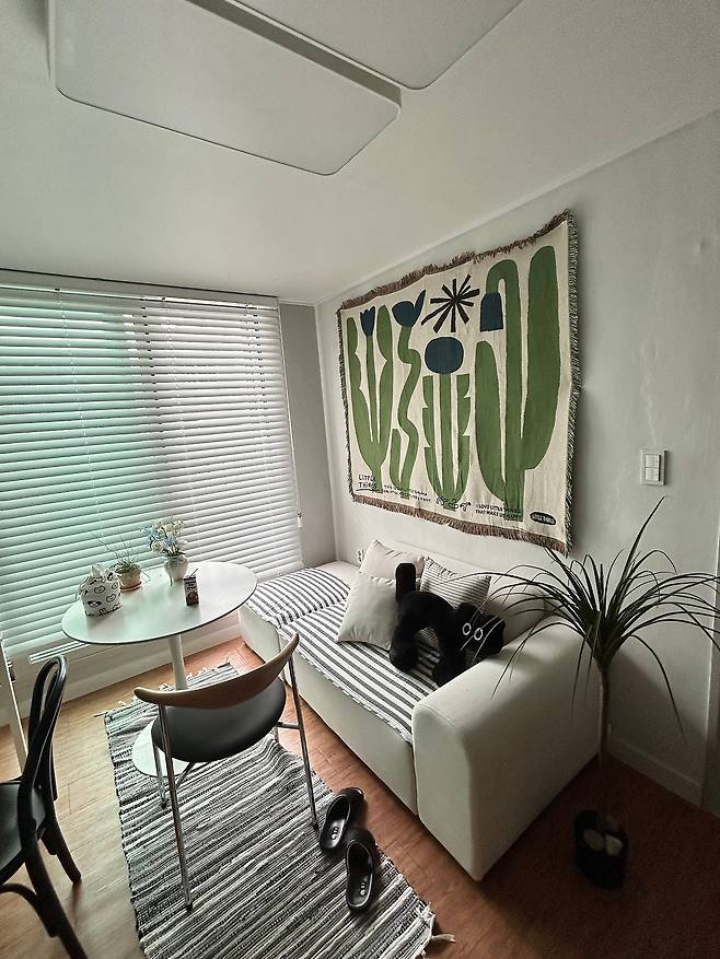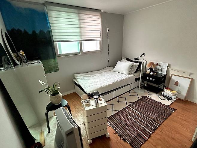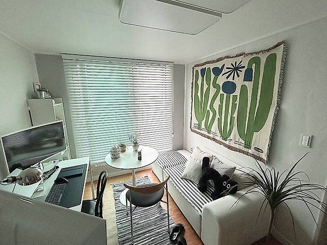 이 모든 것을 충족하는 집을 보고 참 군더더기가 없는 집이라고 생각했던 것 같아요. 혼자 살기에 딱 적합한 구조와 평수라는 느낌이 들더라고요. 마음에 들지 않던 마룻바닥 컬러도 꾸미고 나니 적절하게 잘 어울리는 것 같고요.