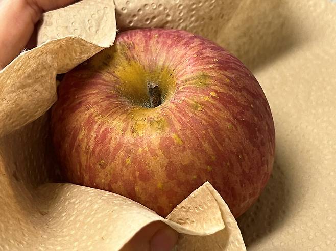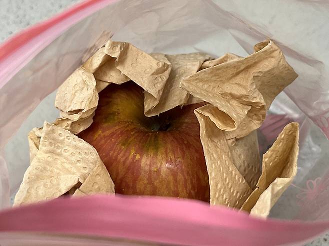 사과는 그냥 보관하기보다 키친타월에 감싸 보관하면 좋습니다. 키친타월이 과일 표면의 수분을 흡수하고, 외부 충격을 완화해 주기 때문에 사과가 상하는 것을 늦출 수 있습니다.