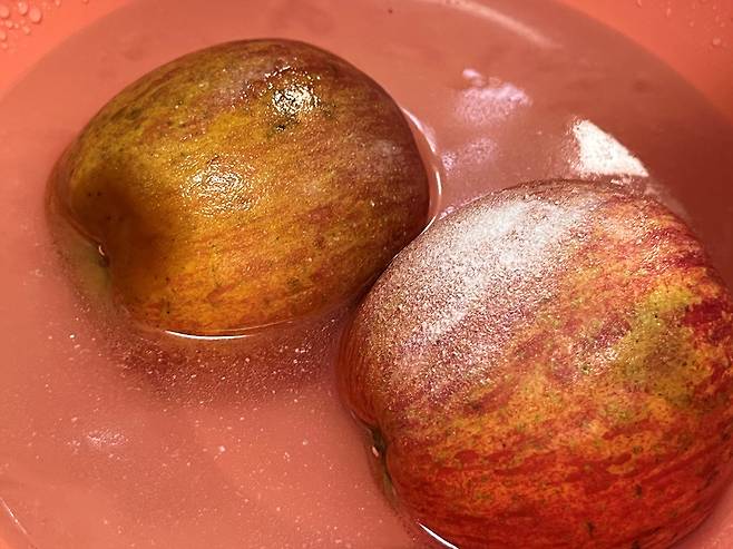 베이킹소다를 물에 풀고 5~10분 정도 둡니다. 베이킹소다는 약알칼리성으로, 사과 껍질의 농약 잔류물을 중화시켜 분해해 줍니다. 또한, 왁스나 기름성분을 부드럽게 녹이는 효과가 있습니다.