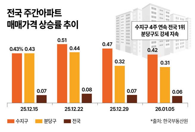 한국부동산원 통계에 따르면 수지구 아파트값은 12월 첫째 주 0.42% 상승했다. 지역 내 2019년 입주 단지인 ‘성복역 롯데캐슬 골드타운’ 전용 84㎡는 12월 15억7500만 원에 거래되며 신고가를 기록했고 시장 호가는 16억 원을 웃도는 수준으로 형성돼 있다는 게 업계 설명이다.