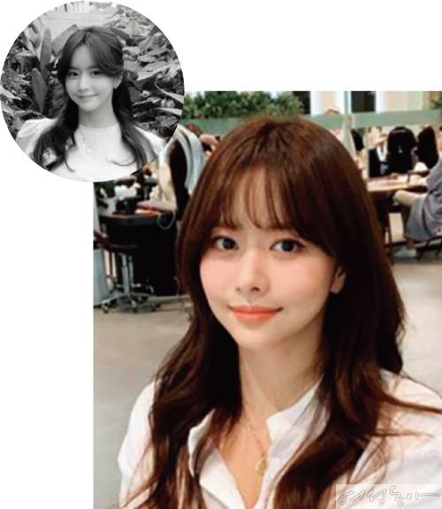 얼굴선을 따라 자연스럽게 흐르는 여신 앞머리에서 '시스루 뱅’ 앞머리로 변신한 한보름. 시스루 뱅은 무거운 뱅보다는 이마가 살짝 비쳐 여성스러운 분위기를 풍긴다. 앞머리가 옆으로 점점 길어져 옆머리와 자연스럽게 이어지는 스타일로, 단발이나 긴 머리 모두 무난하게 잘 어울린다. 시스루 뱅은 역삼각형 또는 각진 얼굴에 연출하면 부드러워 보이고, 관자놀이가 너무 넓거나 헤어라인에 숱이 적은 사람은 단점을 보완해준다. 스타일링할 때는 뿌리 볼륨보다는 모발 끝 쪽에 C컬을 연출해 자연스럽게 넘어가게 완성하면 세련돼 보인다.