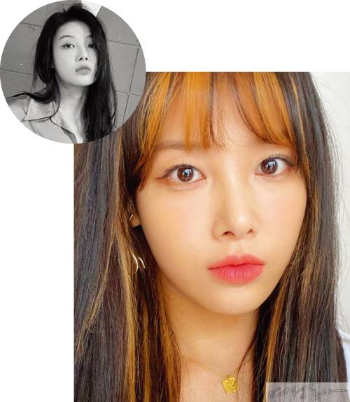 최근 트렌드로 떠오른 유니크한 블리치 헤어를 연출하고 싶다면 유빈의 스타일을 참고하자. 그녀는 '세미시스루 뱅’ 앞머리를 중간중간 밝게 염색하고 옆머리에도 자연스럽게 이어지도록 블리치로 연출해 트렌디한 헤어스타일을 완성했다. 앞머리를 밝은 컬러로 염색할 때는 머리숱을 좀 더 풍성하게 자르는 것이 관건. 머리숱이 너무 적으면 이마가 넓어 보일 수 있기 때문이다. 염색 컬러는 피부톤을 고려해 선택하는 것이 현명하다. 웜톤이라면 오렌지, 자주, 퍼플같은 붉은 색상으로, 쿨톤이면 그레이, 카키 등의 컬러로 염색할 것.