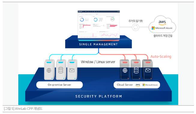 안랩 CPP는 온프레미스 상 윈도·리눅스 서버, 아마존웹서비스(AWS), 애저 클라우드에서 윈도·리눅스 서버 가시성과 통합 관리를 지원한다. AWS, 애저 클라우드 계정과 연동해 오토 스케일링되는 단말에 자동 식별을 지원한다.