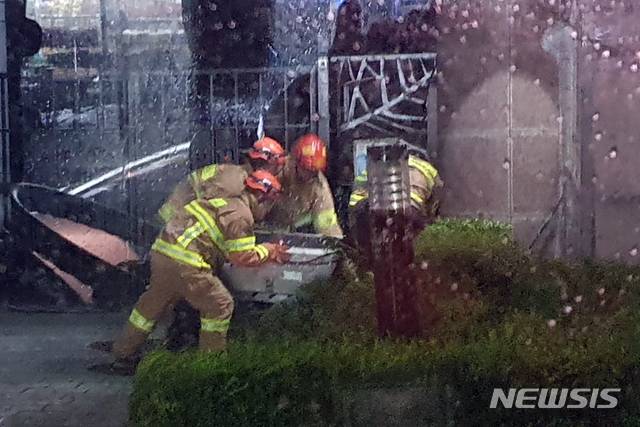 [부산=뉴시스] 제9호 태풍 '마이삭'(MAYSAK)의 영향으로 부산지역에 태풍경보가 발효된 2일 밤 해운대구의 한 건물 앞에서 소방대원들이 강풍에 떨어진 에어컨 실외기를 치우고 있다. (사진=부산소방재난본부 제공). 2020.09.03