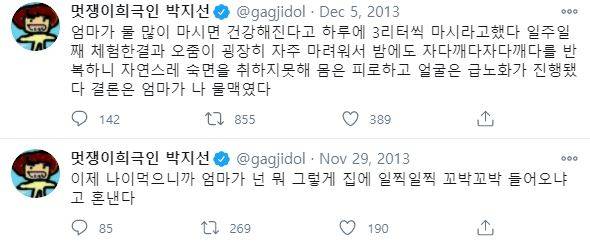 박지선 씨는 트위터를 통해 누리꾼들에게 웃음을 주곤 했는데, 어머니와 티격태격하는 상황을 웃음 소재로 활용하는 경우가 많았다.