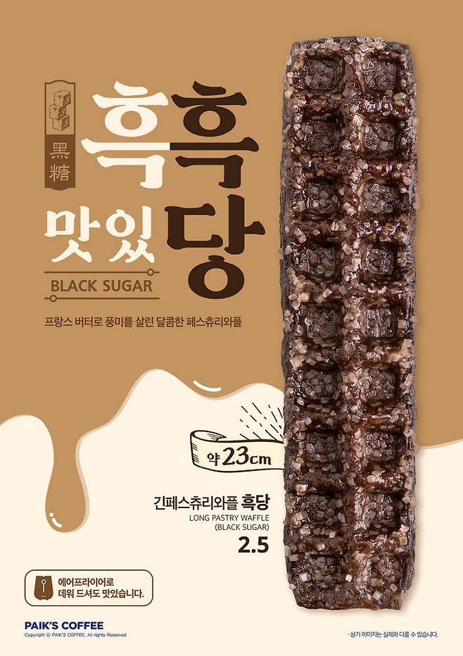 이번 신메뉴는 빽다방이 지난 2월 선보인 '긴페스츄리와플'의 새로운 버전으로 달콤한 흑당의 풍미를 더해 한층 더 고급스러운 맛을 자랑한다.