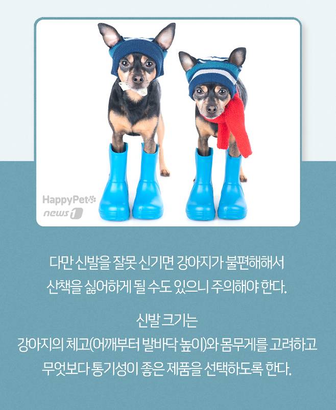 다만 신발을 잘못 신기면 강아지가 불편해해서 산책을 싫어하게 될 수도 있으니 주의해야 한다. 신발 크기는 강아지의 체고(어깨부터 발바닥 높이)와 몸무게를 고려하고 무엇보다 통기성이 좋은 제품을 선택하도록 한다.