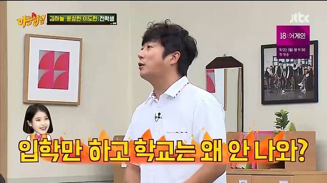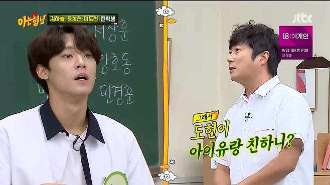 한편 이수근은 도현에게 "아이유와 친하느냐"고 물었다. "친하다"는 도현의 답에, 이수근은 "왜 전학을 왔는데 학교에 안 나오냐. 나오라고 전해달라"고 말했고, 강호동 또한 "전학만 오고 다 무단결석 한다"고 말해 폭소케 했다.