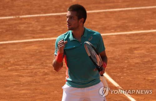 epa08668453 Borna Coric of Croatia reacts during his Men's Singles first round match against Cristian Garin of Chile at the Italian Open tennis tournament in Rome, Italy, 14 September 2020. EPA/Clive Brunskill / POOL
