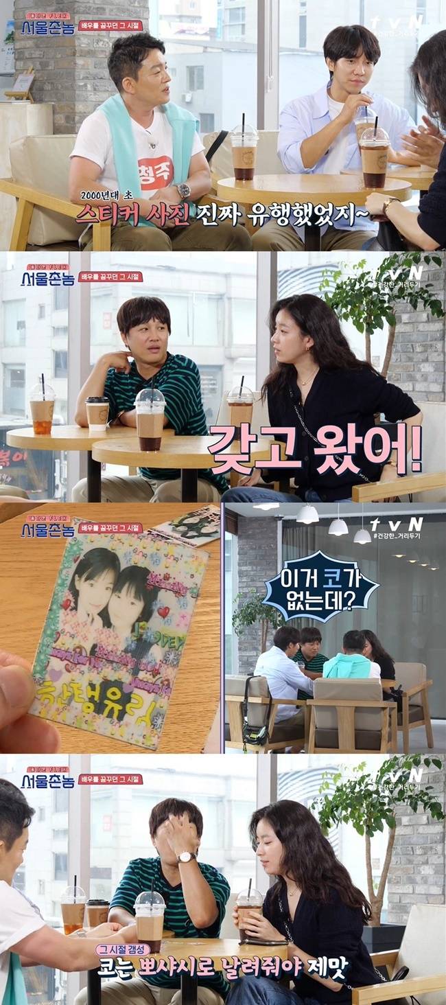 코가 없어질 정도로 뽀샤시한 예전 스티커 사진에 한효주는 "원래 다 날아가는 거다"고 말했고, 이승기는 “효주 비주얼이면 길거리 캐스팅감인데”라며 변함없는 미모에 감탄했다.(사진=tvN '서울촌놈' 캡처)