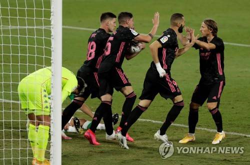 epa08699907 Real Madrid's Karim Benzema (2-R) and Luka Modric (R) celebrate the own goal scored by Real Betis during the Spanish LaLiga soccer match between Real Betis and Real Madrid held at Benito Villamarin Stadium in Seville, Spain, 26 September 2020. EPA/JULIO MUNOZ