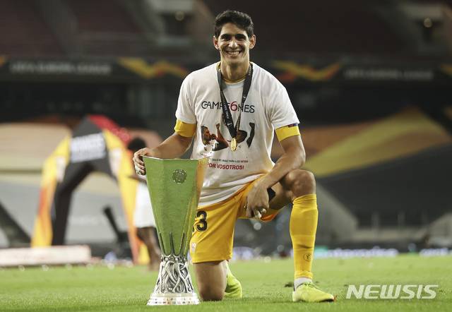 [쾰른=AP/뉴시스]세비야(스페인) 골키퍼 야신 부누가 21일(현지시간) 독일 쾰른에서 열린 인테르 밀란(이탈리아)과의 2019-20 UEFA 유로파리그 결승전에서 승리한 후 우승컵과 함께 포즈를 취하고 있다. 세비야는 인테르 밀란에 3-2로 승리해 우승하며 통산 6번째 우승컵을 들어 올렸다. 2020.08.22.