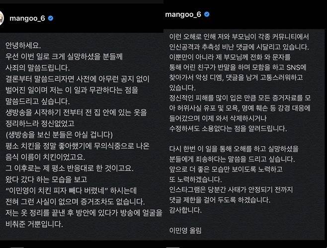 이어 "생방송을 시작하기 전부터 집 안에 있는 옷을 정리하느라 정신없었고, 평소 치킨을 좋아해 무의식중으로 치킨을 말했다. 왔다 갔다 하는 모습을 보고 '이민영이 치킨 피자 빼다 버렸네'라고 하는데, 전혀 그런 사실이 없으며 증거조차도 없다"라고 해명했다.