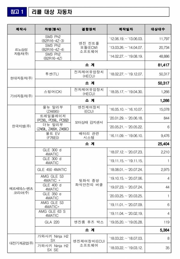 현대ㆍ기아차 투싼(TL), 스팅어(CK) 2개 차종 5만1583대는 전자제어 유압장치 내부 합선으로 인한 화재 발생 가능성이 확인돼 지난 24일부터 직영 및 서비스 협력업체를 통해 리콜 무상 수리를 진행하고 있다. 한국지엠 올뉴 말리부 1만5078대는 엔진제어장치(ECU) 소프트웨어 오류로 인해 저속 또는 후진 시 가속페달을 약하게 밟았다 떼는 경우, 간헐적으로 시동이 꺼질 가능성이 확인됐다.