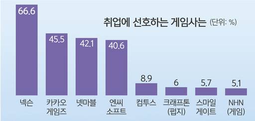 잡코리아가 게임분야 전문 취업포털 게임잡과 함께 지난해 게임회사 취업을 준비하는 구직자 1309명을 대상으로 ‘게임사 취업 선호도’를 조사한 결과 취준생들이 가장 취업하고 싶어하는 게임회사는 ‘넥슨’으로 나타났다. 다음으로 ‘카카오게임즈’ 45.5%와 ‘넷마블’ 42.1%, ‘엔씨소프트’ 40.6%가 순위에 올랐다.