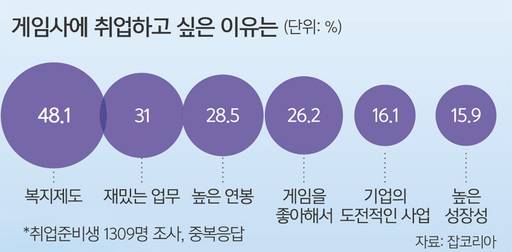 이러한 복지 혜택 말고도 연봉과 인센티브 제도, IPO(기업공개) 등 성장 가능성도 취업준비생들이 게임사로 몰리는 이유 중 하나다. 게임사의 주요 직군인 게임 개발자들의 경우 게임의 성공 여부에 따라 확실한 인센티브를 지급하는 문화가 팽배하다. 2018년 글로벌 게임 흥행작 ‘배틀그라운드’를 제작한 펍지는 직원들에게 1인당 최대 50억원에 달하는 성과급을 지급하기도 했다. 지난 10일 코스닥 상장에 성공한 카카오게임즈 직원들은 상장 첫날 따상(시초가가 공모가의 2배로 결정된 후 상장 첫날 상한가)을 기록하면서 주식매수선택권(스톡옵션)으로 1인당 5억원 이상 평가차익을 얻게 됐다.