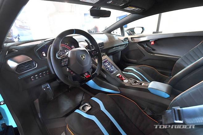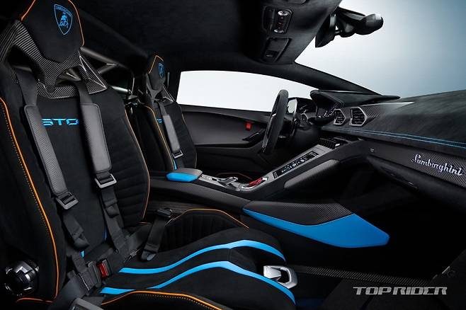 실내에는 람보르기니 카본 스킨과 조화를 이룬 알칸타라 소재, 카펫을 대체한 탄소 섬유 바닥 매트, 탄소 섬유 카본 시트, 4점식 안전벨트가 있는 롤 바 등이 적용됐다. HMI 그래픽은 주행모드, LDVI 시스템, 타이어 압력, 브레이크 온도 등 차량 주요 기능을 제어할 수 있다.