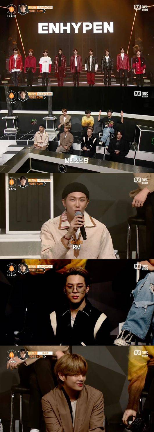 방탄소년단(RM, 진, 슈가, 제이홉, 지민, 뷔, 정국)도 아이랜더들을 응원하기 위해 '아이랜드'를 방문했다. 방탄소년단 리더 RM은 "부모님과 친구 제외하고 방탄소년단이라는 그룹명을 얘기하지 않았던 아픈 기억이 있지만, 엔하이픈은 우리보다 훨씬 더 멋지고 예쁘다. 우리도 엔하이픈의 시작을 응원하겠다"고 너스레를 떨었다.