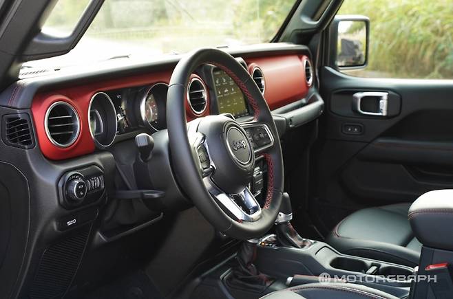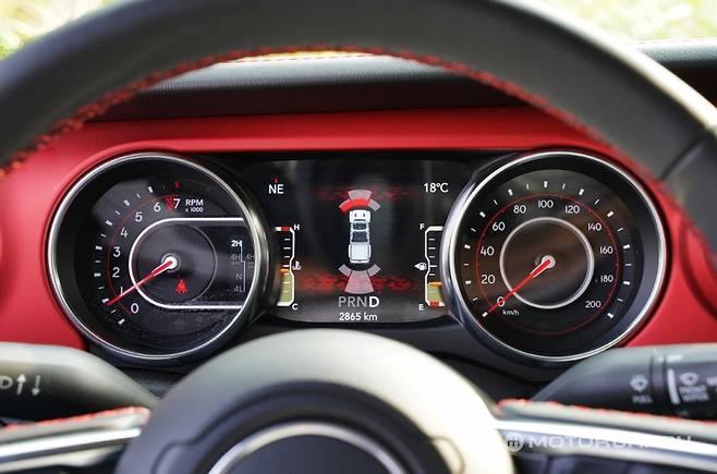 그에 비해 글래디에이터는 한층 화려하고, 더 많은 정보를 제공한다. 7인치 컬러 디스플레이를 통해 기본 정보 외에도 접근각과 이탈각을 보여주는 오프로드 화면과 차간거리 유지 등 별도 화면을 추가 제공한다. 빨간색을 더한 현란한 좌우 계기판은 최신 트렌드를 반영했다.