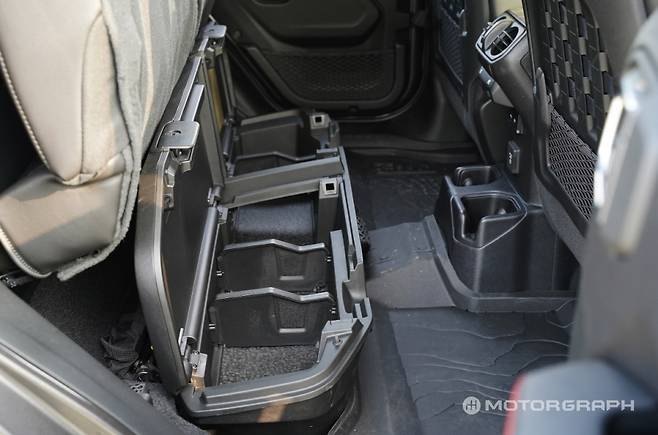 두 차 모두 뒷좌석 아래 넉넉한 수납 공간이 적용됐는데, 이 부분은 확실히 지프가 더 신경을 썼다. 수납 공간 마련하는 것을 넘어 수납함 상단에 케이스로 마감하고, 충전 잭이 포함된 블루투스 스피커를 장착했다.