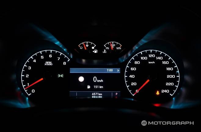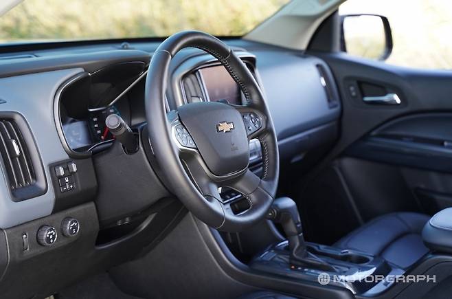 콜로라도 계기판은 4.2인치 컬러 디스플레이가 적용된 아날로그 타입이다. 그래픽은 과거 쉐보레 브랜드를 경험한 이들에게 친숙한 그 모습이다. 브랜드 실내 메인 컬러인 아이스 블루가 계기판에 적용됐으며, 조명 외에 멋 부리지 않는 좌우 계기판은 단정해 보인다.