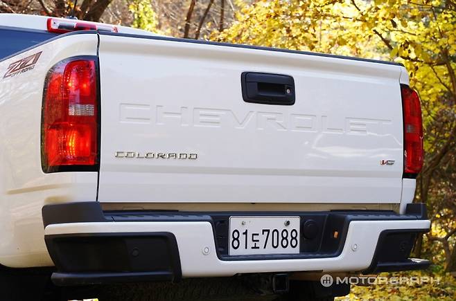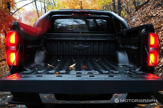콜로라도 적재함 용량은 1170리터, 최대 적재 중량은 400kg이다. 범퍼 양쪽 끝에 발판을 마련해 오르내리기가 쉽고, 별도의 표면 처리를 통해 미끄러짐 방지 및 내구성을 확보했다. 한국GM은 최대 적재 중량을 400kg으로 등록했지만, 실제 700kg까지 적재가 가능하다고. 단순히 짐을 적재하는 것을 넘어 주행 상황까지 고려하여 낮게 신고한 셈이다.